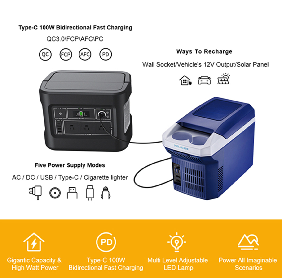 Ky termocentral portativ 1000W mbështet një sërë pajisjesh elektrike, si mini frigorifer, kazan, llambë elektrike, etj.